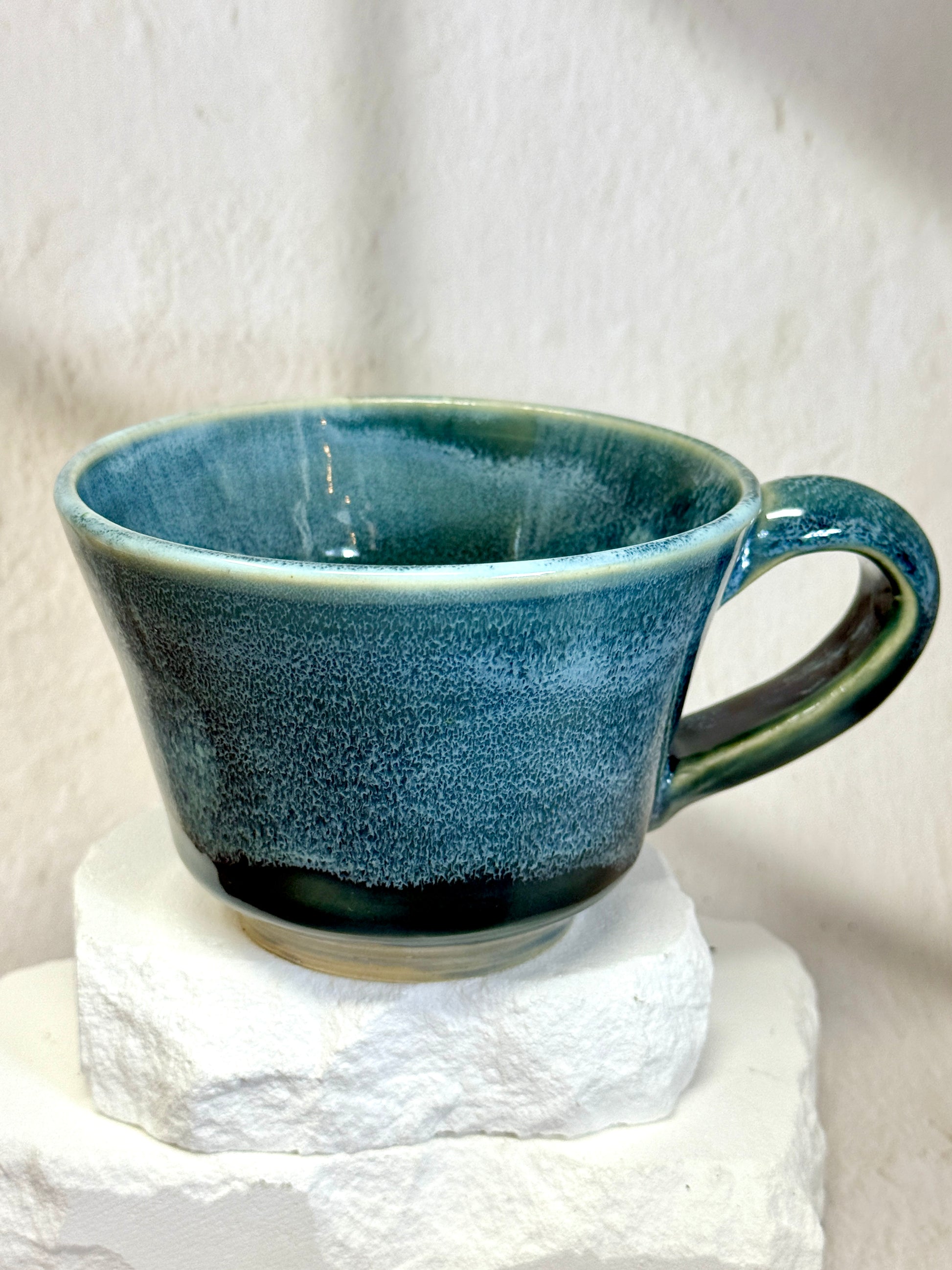 Hand-thrown stoneware mug finished in layered oceanic blues. The glaze shifts from deep teal at the base to a soft misted blue near the rim, evoking the calm depth of coastal waters. Its broad shape offers generous comfort for your hands and an ideal surface for capturing glaze variation. Perfect for slow mornings with a latte, coffee, tea, or cocoa.
