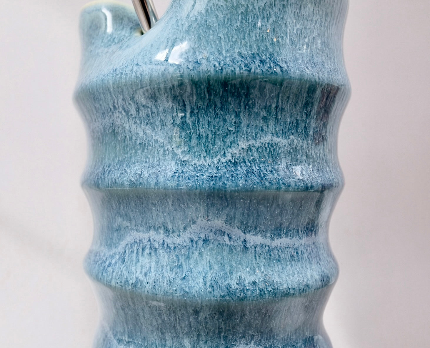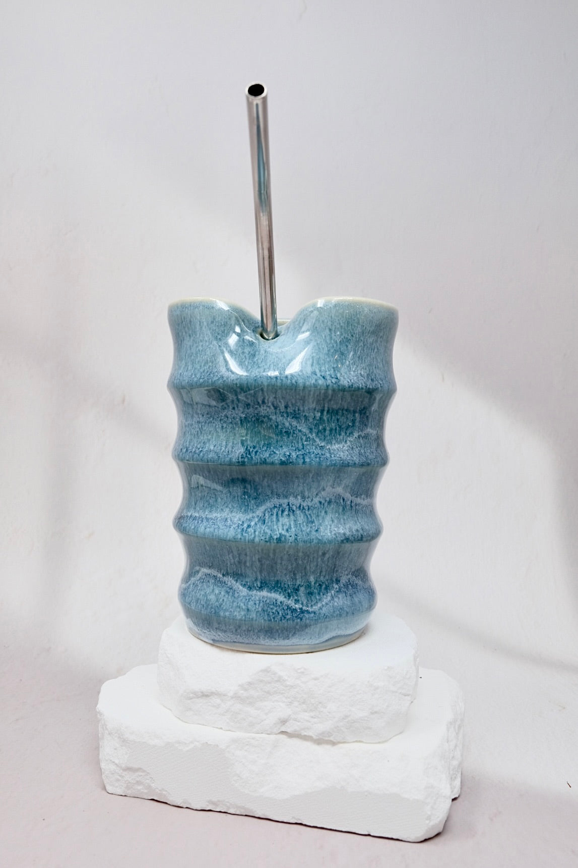 Hand-thrown stoneware mug with a rippled body and smooth, wave-like glaze transitions from soft blue to seafoam white. Each ridge catches the light, creating depth and movement reminiscent of coastal tides. The ergonomic lip notch adds both comfort and modern character, perfect for sipping tea, coffee, or yerba mate through a straw.