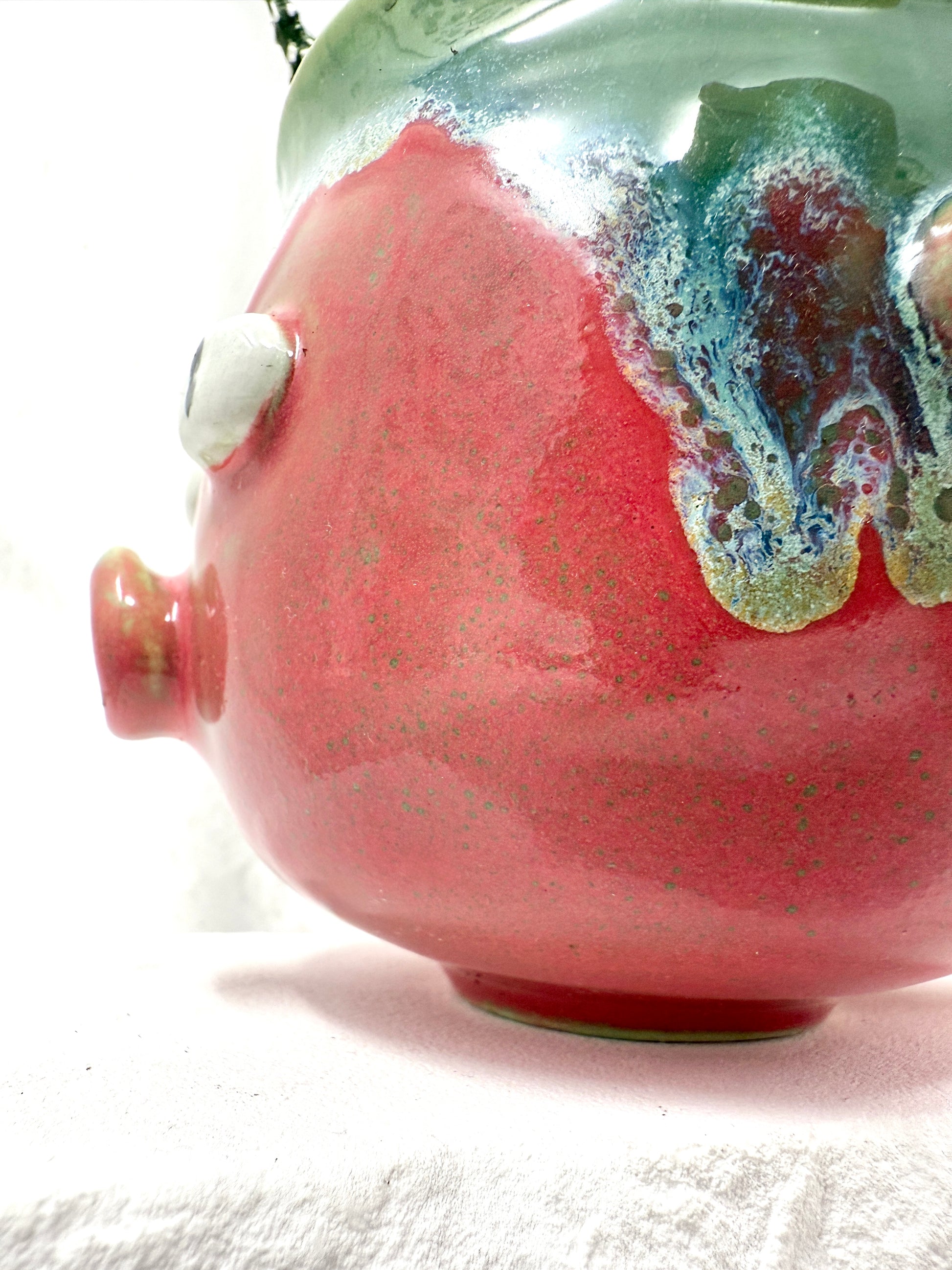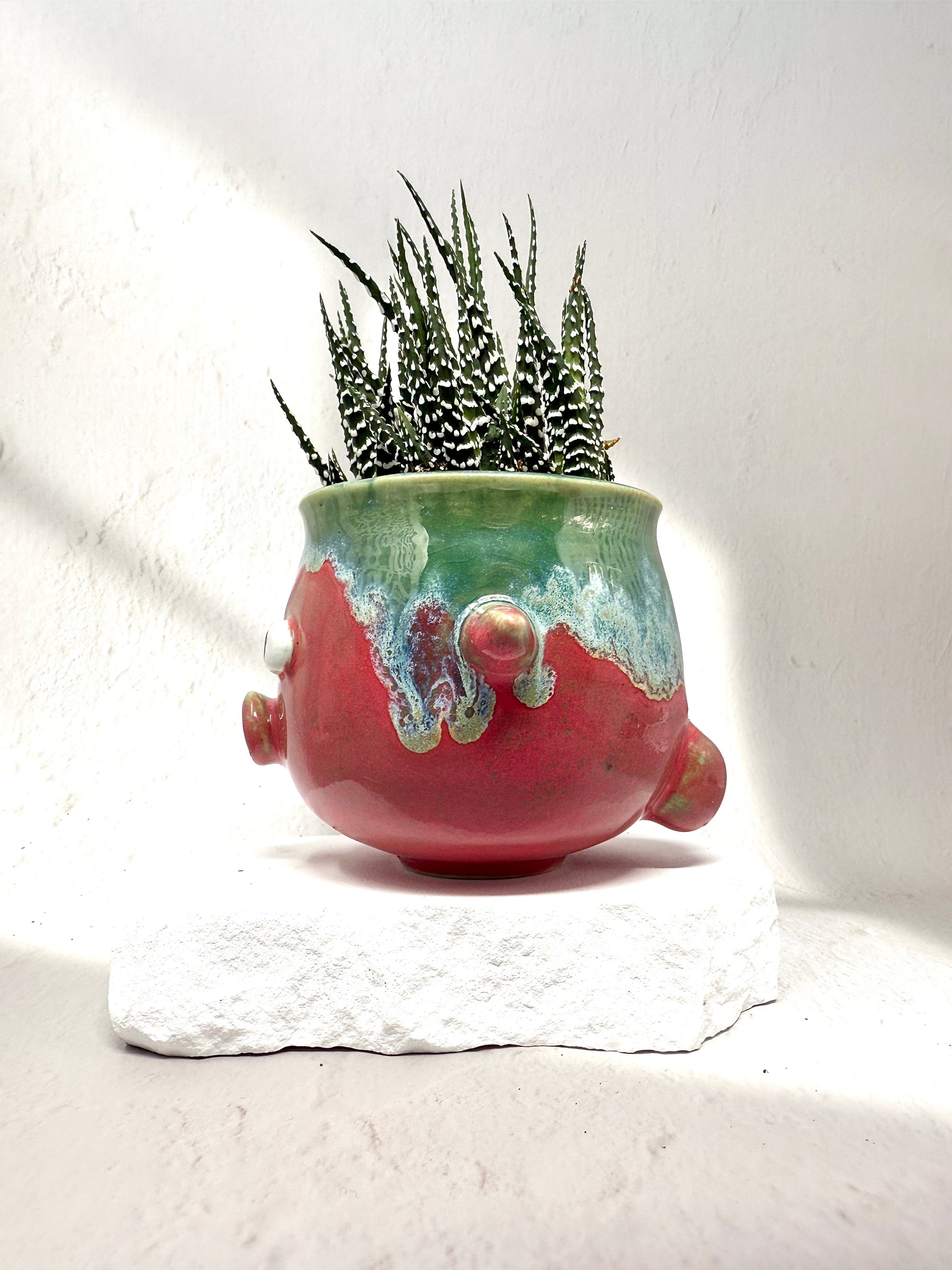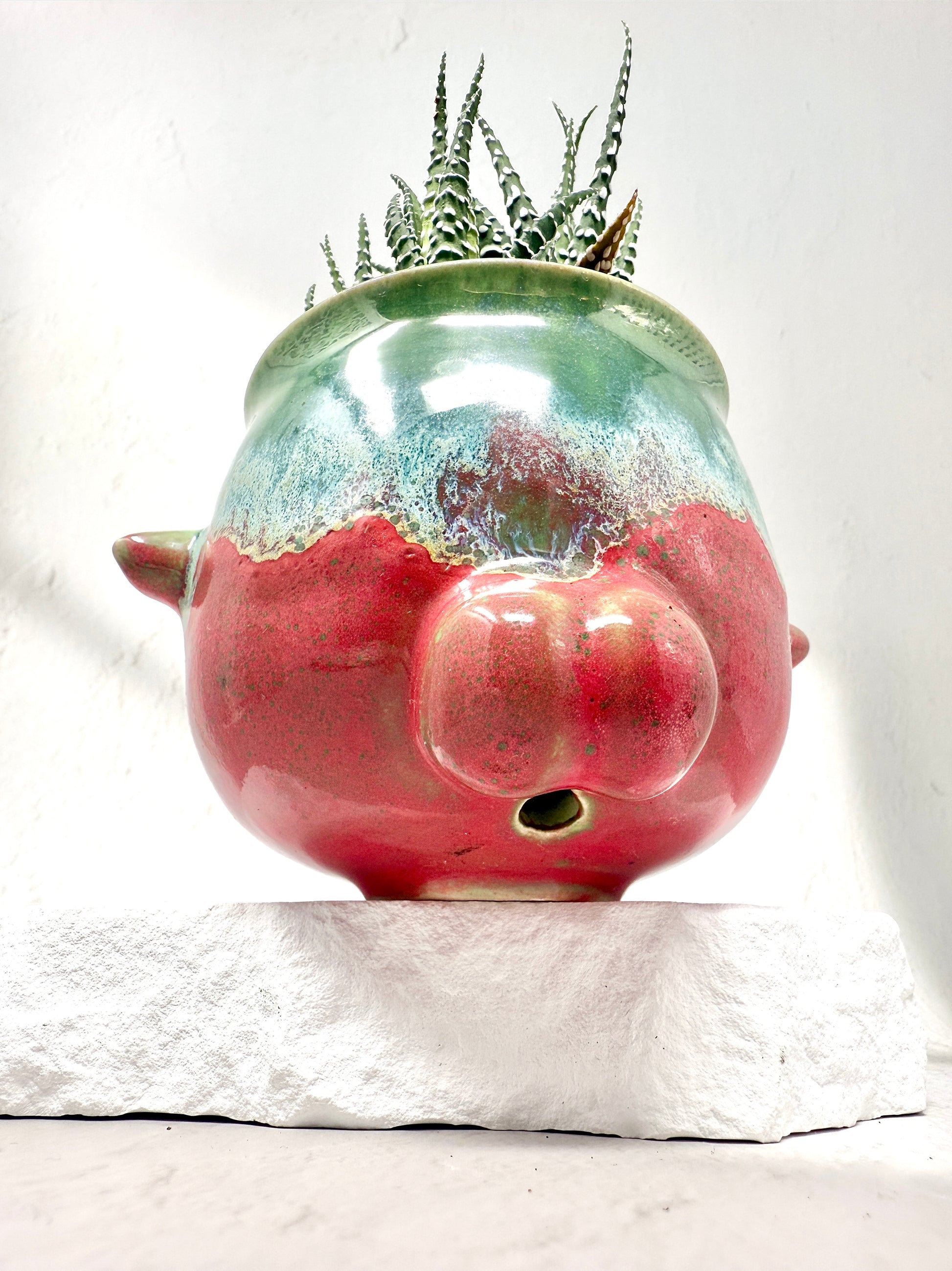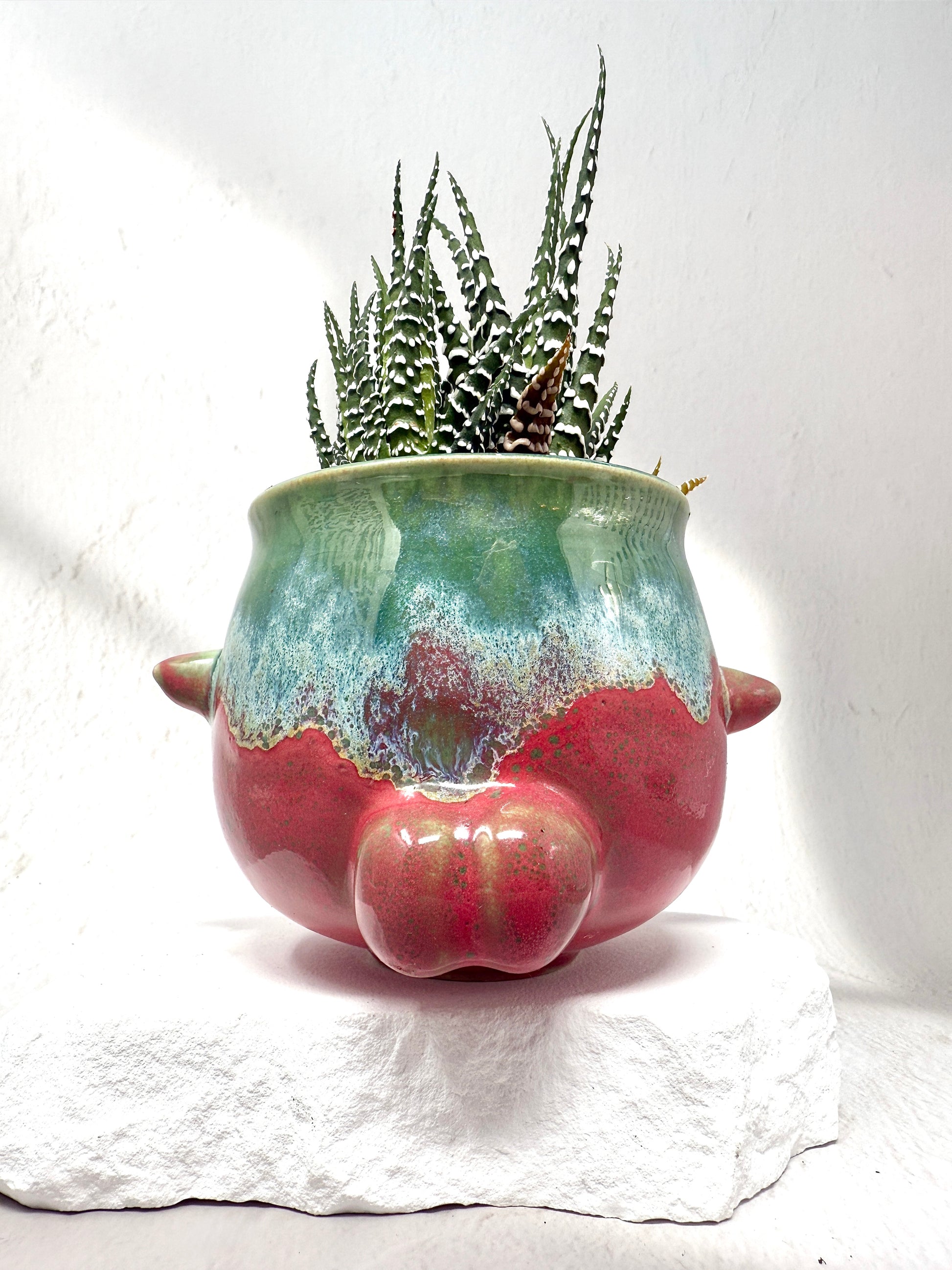Add some humour to your plant’s life by pairing it with our Bobo planter. Bobo is part of our Toon Ceramics line and is made to add decoration to your home but also a lot of laughter. He carries a very big backside and the drainage hole is right underneath that bum to accommodate any water or other things that Bobo needs to release to help the plant that lives inside him grow. Bobo sports polkadot skin and has hair that drips down with a very sleek glossy green glaze. He is definitely an eye catching peace and you will love having him in your home.